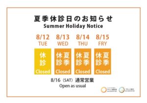 【お知らせ】夏季休診のお知らせ 2025 8/09 当院からのお知らせ アキュラ漢方 2025年8月9日 8/11(月)~15(金)夏季休診とさせていただきます。 8/16(土)~通常診察いたします。よろしくお願いいたします。 アキュラ鍼灸院・アキュラ漢方 当院からのお知らせ アキュラ漢方 この記事が気に入ったら いいね または フォローしてね! Follow @acuraclinic Follow Me コメント コメントする コメントをキャンセルコメント ※ 名前 ※ メール ※ サイト 次回のコメントで使用するためブラウザーに自分の名前、メールアドレス、サイトを保存する。 Δ