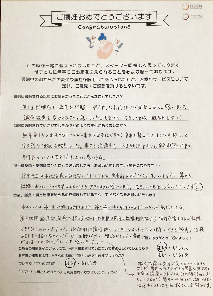 第1子の治療でお越しくださって以降、産後の体調ケアを経てお二人目の妊活にも伴走させていただき、とても感慨深くまた光栄に存じます。