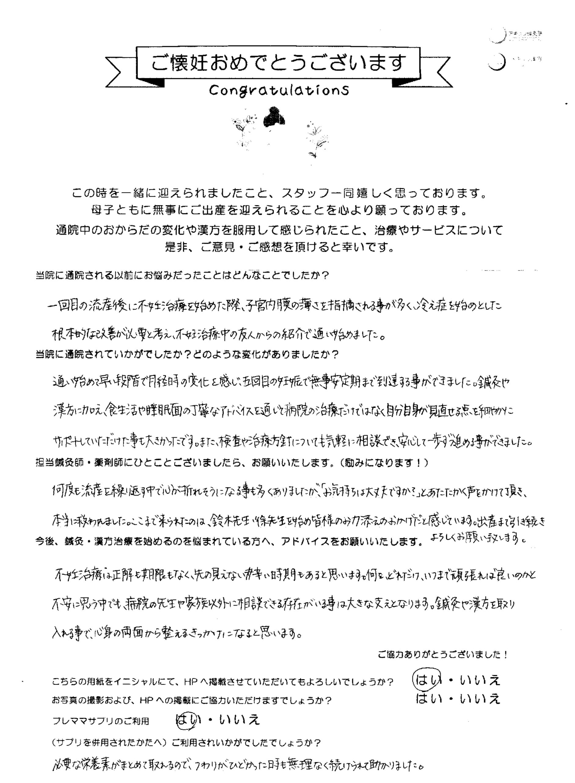 通い始めて早い段階で月経時の変化を感じ、5回目の妊娠で無事安定期まで到達する事ができました。鍼灸や漢方に加え、食生活や睡眠面の丁寧なアドバイスを通じて、病院の治療だけではなく自分自身が見直せる点を細やかにサポートしていただけた事も大きかったです。また、検査や治療方針についても気軽に相談でき安心して一歩ずつ進めることが出来ました。