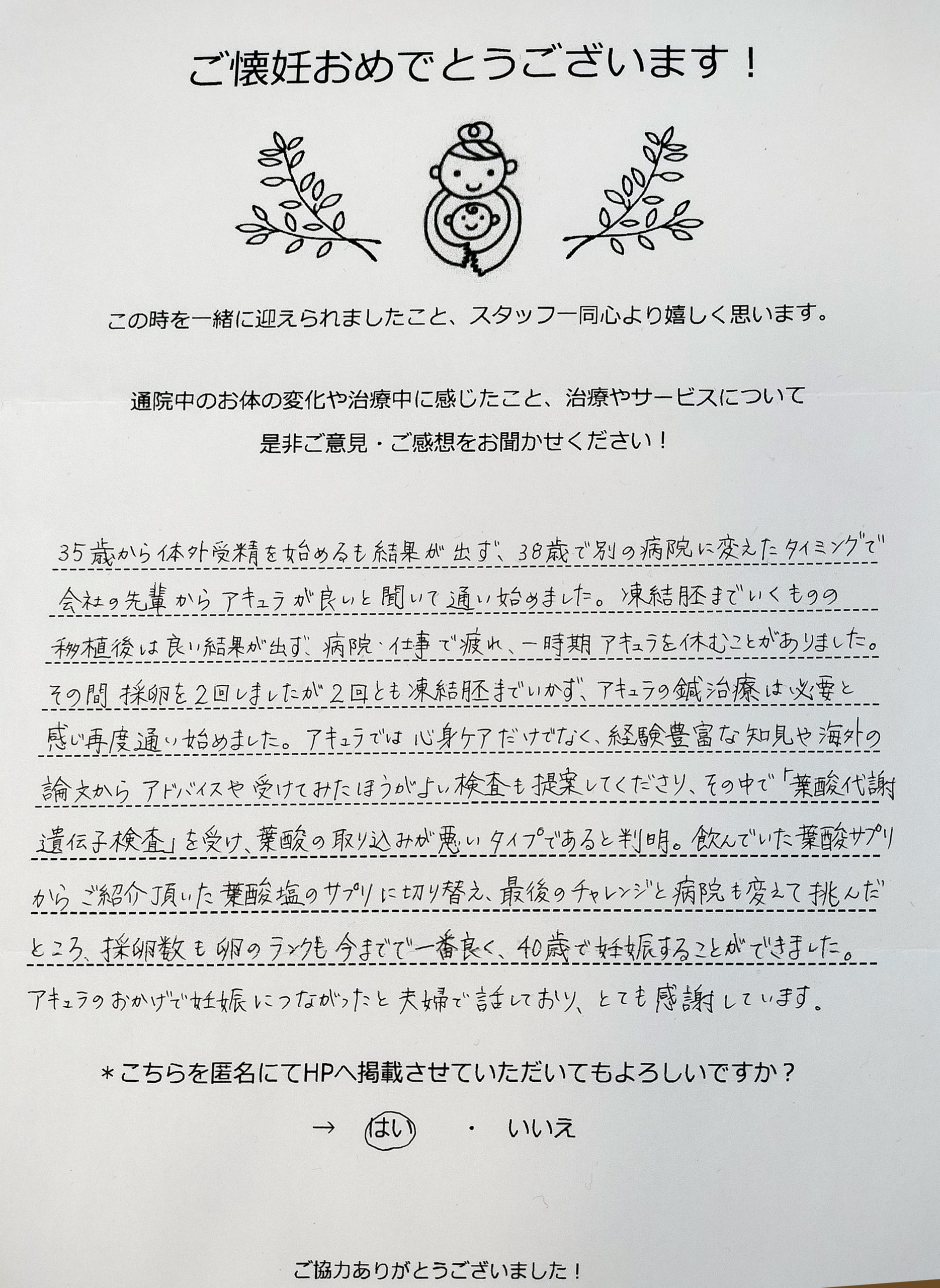 アキュラでは心身ケアだけでなく、経験豊富な知見や海外の論文からアドバイスや受けてみた方がよい検査も提案してくださり、その中で「葉酸代謝遺伝子検査」を受け、葉酸の取込みが悪いタイプであると判明。飲んでいた葉酸サプリからご紹介頂いた葉酸塩のサプリに切り替え、最後のチャンスと病院も変えて挑んだところ、採卵数も卵のランクも今まで一番よく、40歳で妊娠することが出来ました。
