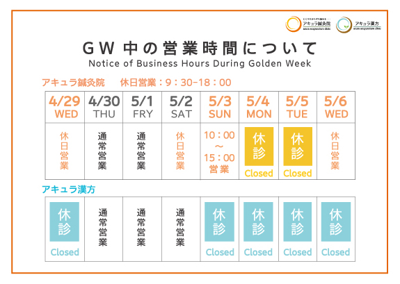 【お知らせ】GW営業時間のお知らせ 2026 4/01 当院からのお知らせ アキュラ漢方 2026年4月1日 ゴールデンウイークの営業につきましては、上記のスケジュールとなっております。ご予約等事前にご確認の上、よろしくお願いいたします。 アキュラ鍼灸院・アキュラ漢方 患者様の口コミ・評判 初めての方へ完全予約制です。初診当日にご用意いただくものなどご確認ください。 当院の不妊鍼灸治療それぞれの妊活ステージに合わせた不妊鍼灸を行います。 料金案内クレジットカード、PayPayキャッシュレス決済に対応しています。 今すぐ予約する!WEB予約 LINE で簡単予約 ! 診療時間(火曜日休診)10:00~21:00(月〜木)10:00~19:00(金)9:30~18:00(土・日・祝) HOME 当鍼灸院について 院長の紹介 鍼灸師・薬剤師・顧問医師紹介 患者様の声 一般の鍼灸治療 メディア掲載・取材 論文要約・学会発表 鍼灸師の募集・採用について 不妊鍼灸説明会インスタライブ 初めての方へ WEB予約の手順 問診表ダウンロード 治療後のお体のケアについて 新型コロナ後遺症に対する鍼灸治療のご案内 不妊鍼灸治療 アキュラ鍼灸院の強みは? なぜ、鍼灸が不妊に効果があるの? 鍼灸で着床率を上げる(着床鍼灸スケジュール) カップル不妊鍼灸治療 不妊と自律神経について よくある質問 不妊鍼灸治療症例紹介 着床障害・着床不全 体質改善(慢性的な不調や不妊に関する疾患がある方) 卵子の質を改善 不育症(習慣流産) 男性不妊 出産・妊娠報告 妊娠中の鍼灸治療 マタニティー鍼灸 逆子鍼灸 不妊漢方相談 不妊漢方ブログ 料金案内 アクセス(渋谷本院) アクセス(京野アートクリニック高輪分院) 妊活サプリとお灸について 妊活・不妊に効果的なお灸のツボの紹介 動画で解説 – 妊活お灸のツボ事典 妊活応援ブログ English 免責事項及び個人情報の扱いについて 当院からのお知らせ アキュラ漢方 この記事が気に入ったら いいね または フォローしてね! Follow @acuraclinic Follow Me コメント コメントする コメントをキャンセルコメント ※ 名前 ※ メール ※ サイト 次回のコメントで使用するためブラウザーに自分の名前、メールアドレス、サイトを保存する。 Δ